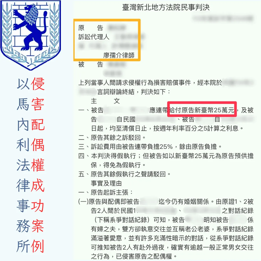 【侵害配偶權(原告方)成功案例】廖孺介律師如何在原告無法提供「配偶與第三者間」有性行為的證據,卻成功說服法院作出讓對方賠償原告新臺幣25萬元的判決呢?