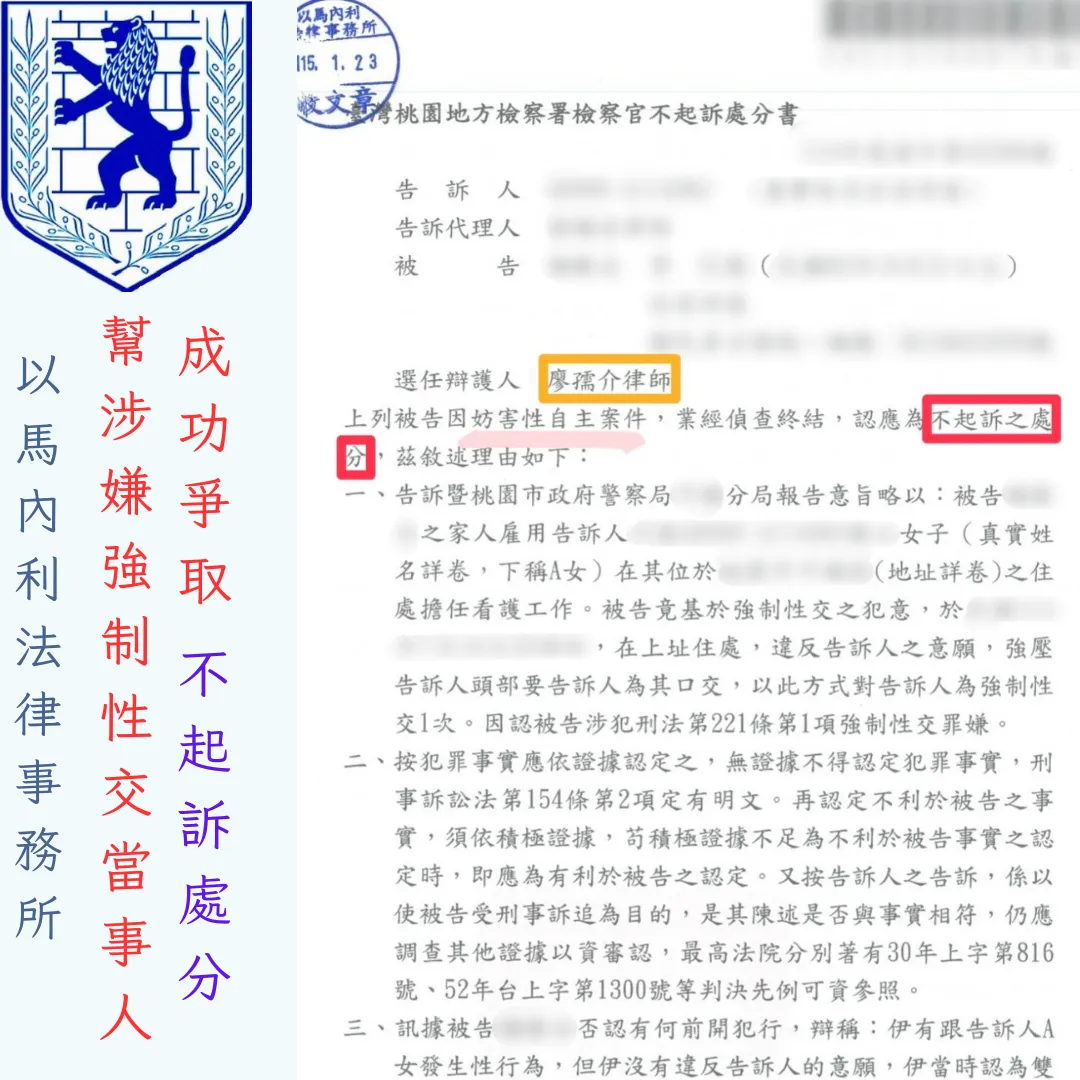 首頁 > 成功案例 > 刑事案件 > 幫涉嫌強制性交當事人,成功爭取不起訴處分