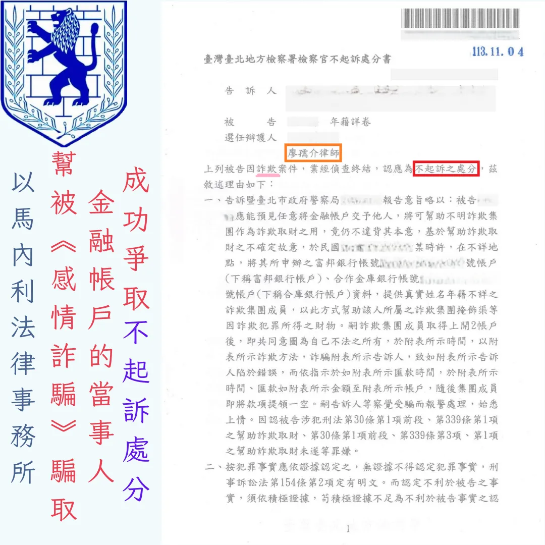 首頁 > 成功案例 > 刑事案件 > 詐欺、洗錢 > 幫被「感情詐騙」騙取金融帳戶的當事人,成功爭取不起訴處分